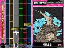 The interface is similar to other games in the Bemani series. Two note scrolls—one for each player—are displayed at the left and right sides of the screen. Colorful animations for each song are displayed in the center of the screen. Each note scroll consists of four columns: one each for the red, green, and blue buttons, and a fourth column, known as the Wailing Bonus column. Individual notes and chords are represented by small colored bars that scroll upward in the columns. To play the correct note, the player must hold down the buttons corresponding to the colored bars, and move the fret lever when the bars reach the yellow fretting line. When a guitar icon is displayed in the Wailing Bonus column along with an associated note, the player can tilt the guitar upright while playing the note to receive bonus points.