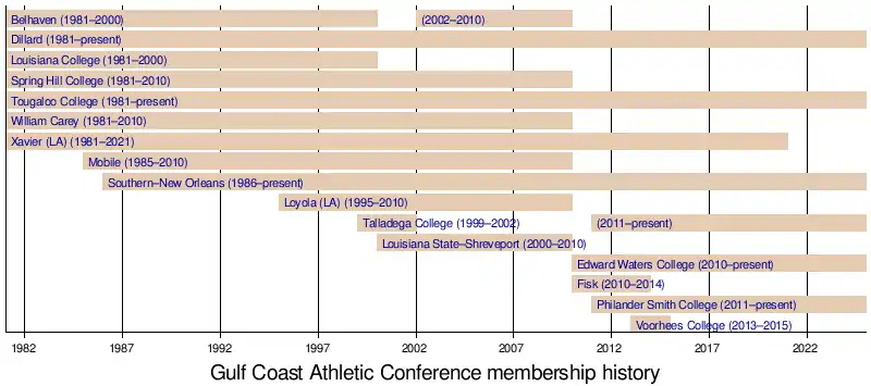 Louisiana College left the GCAC to join the American Southwest Conference of the National Collegiate Athletic Association (NCAA) Division III in 2000. Belhaven also left in 2000, only to re-join in 2002; while Talladega College, which joined in 1999, left in 2002. In 2010, Belhaven, Loyola-New Orleans, Spring Hill, Mobile and William Carey left the GCAC to join the Southern States Athletic Conference (SSAC).[2] In 2010 LSU-Shreveport left the conference to join the Red River Athletic Conference (RRAC). Edward Waters College and Fisk University joined to replace the departed schools in 2010. Philander Smith College also joined the GCAC in 2011. Talladega College re-joined the conference starting in the 2011-12 academic year. Talladega had been a member of the GCAC from 1999-2002.[3]