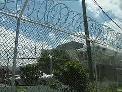 At the establishment of the new court in 1974, the Manley administration quickly build a new Gun Court compound (17°59′5″N 76°46′43″W) at South Camp Road, Kingston, with both court and prison facilities. The Gun Court Prison was defended by guard towers and barbed wire, earning it the nickname of "Jamaica's Stalag 17,"[3] and the walls were painted bright red "to show that it [is] dread."[18] It held 320 inmates in 1986.[13] The courtrooms housed the High Court and Resident Magistrate's divisions of the Gun Court until 1999, when they were converted to a "Peace Centre" dedicated to pursuing community mediation of disputes. The High Court division now sits in the Supreme Court building, and the Resident Magistrate's division sits in the Half Way Tree Courthouse. The prison itself remains in operation as the South Camp Adult Correctional Centre,[19] housing inmates convicted by the Gun Court.[20]