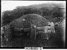He developed a serious disease in July 975 (fifth month of the Lunar calendar) and died just a few days later at the age of 50.[2] He was given the posthumous name of "Hongdoseon-yeolpyeongse sukheon-ui hyoganghye daeseong dae-wang" (Korean: 홍도선열평세숙헌의효강혜대성대왕; Hanja: 弘道宣烈平世肅憲懿孝康惠大成大王),[13] while his temple name Gwangjong means "shining emperor". His tomb, called Heolleung (Korean: 헌릉; Hanja: 憲陵), is located on the north side of Mount Songak, in Kaepung County, North Korea. The site inspection in 1916 found a severely damaged tomb, but the stairway and the foundation stone are preserved.[14][15]