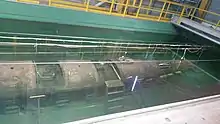 The in situ underwater archaeological investigation and excavation culminated with the raising of Hunley on 8 August 2000.[45] A large team of professionals from the Naval Historical Center's Underwater Archaeology Branch, National Park Service, the South Carolina Institute of Archaeology and Anthropology, and various other individuals investigated the vessel, measuring and documenting her prior to removal. Once the on-site investigation was complete, harnesses were slipped underneath the sub and attached to a truss designed by Oceaneering International. After the last harness had been secured, the crane from the recovery barge Karlissa B hoisted the submarine from the sea floor.[46][47] She was raised from the open waters of the Atlantic Ocean, just over 3.5 nautical miles (6.5 km) from Sullivan's Island outside the entrance to Charleston Harbor. Despite having used a sextant and hand-held compass, thirty years earlier, to plot the wreck's location, Dr. Spence's 52 m (171 ft) accuracy turned out to be well within the length of the recovery barge, which was 64 m (210 ft) long.[48][49] On 8 August 2000, at 08:37, the sub broke the surface for the first time in more than 136 years, greeted by a cheering crowd on shore and in surrounding watercraft, including author Clive Cussler. Once safely on her transporting barge, Hunley was shipped back to Charleston. The removal operation concluded when the submarine was secured inside the Warren Lasch Conservation Center, at the former Charleston Navy Yard in North Charleston, in a specially designed tank of fresh water to await conservation until she could eventually be exposed to air.