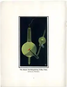 X-rays are generated when high energy electrons are stopped by a hard target. In the earliest tubes, the electrons were generated by the collision of positive ions with the cathode. To produce the ions, a low pressure gas had to be maintained inside the tube. Unfortunately, as this type of tube is used, the low pressure gas is gradually depleted causing the tube current and therefore the x-ray output to fall. The operator could compensate for this by increasing the voltage on the tube, but this would produce "harder" or more penetrating x-rays. In many cases this degraded the image quality. One early solution was to introduce a small amount of gas back into the tube. Unfortunately this procedure was difficult to control and it only provided a temporary solution. Saÿen's design solved this problem by a clever strategy that ensured a constant gas pressure in the tube. As the gas in the main part of the Saÿen tube (see photo) is depleted, the electrical resistance in the tube would increase causing the current to take a lower resistance path: a spark through the air gap to the wire leading to the smaller bulb. That current would heat the material in the small bulb and cause it to release gas back into the main tube. Once the gas pressure rose in the main tube, its electrical resistance would drop back into normal operating range. The gas pressure in the tube could be adjusted by controlling the size of the air gap: a larger gap meant that the tube would operate at a higher voltage with harder (higher energy, more penetrating) x-rays. Saÿen used potash (potassium hydroxide, KOH) in the side bulb but other chemicals that would outgas when heated were also used.[5] James W. Queen & Company manufactured and sold the "Queen Self Regulating X-Ray Tube" for several years.