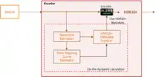 Live use cases are possible by delivering HDR10+ metadata in every frame. HEVC encoders generate and inject metadata on live content and mobile phones record video and create HDR10+[8] metadata in real-time during recording. Live encoding is detailed in the Live Encoder Workflow diagram and real time broadcast operations are supported at the point of transmission enabling a metadata-less broadcast operation.