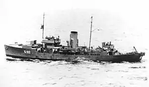 Flower-class corvettes like Matapedia serving with the Royal Canadian Navy during the Second World War were different from earlier and more traditional sail-driven corvettes.[4][5][6] The "corvette" designation was created by the French as a class of small warships; the Royal Navy borrowed the term for a period but discontinued its use in 1877.[7] During the hurried preparations for war in the late 1930s, Winston Churchill reactivated the corvette class, needing a name for smaller ships used in an escort capacity, in this case based on a whaling ship design.[8] The generic name "flower" was used to designate the class of these ships, which – in the Royal Navy – were named after flowering plants.[9]