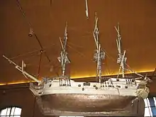 HMS Drake was a Royal Navy 14-gun sloop-of-war with a displacement of 275 tons burthen. Originally named the Royal Oak,[note 1] she was built in New England in 1775 by John Wharton from Philadelphia. She first sailed between London and Stettin as a tobacco-ship. She was then sold in 1776 and renamed Resolution. Captained by Edward Hawker, the ship traded between London, Boston, and Cork. On 4 March 1777 the British navy purchased her at Plymouth for 3,000 pounds sterling. She completed fitting out as a warship on 24 May 1777. She became the ship-rigged sloop-of-war Drake with either 14, 18 or 20 guns. From July 17, 1777, she served in the American Revolutionary War. Her first mission was protecting the packet-boats between Harwich and Gorée [1]