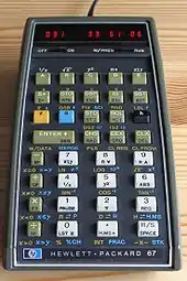 The HP-67 is a magnetic card-programmable handheld calculator, introduced by Hewlett-Packard in 1976 at an MSRP of $450.[1] A desktop version with built-in thermal printer was sold as the HP-97 at a price of $750.[2]
