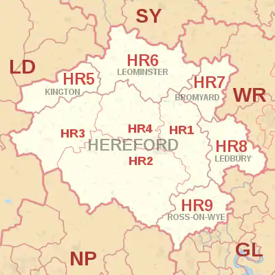 The HR postcode area, also known as the Hereford postcode area,[2] is a group of nine postcode districts in England and Wales, which are subdivisions of six post towns. These cover most of Herefordshire, including Hereford, Bromyard, Kington, Ledbury, Leominster and Ross-on-Wye, while the HR2, HR3 and HR5 districts extend across the border to cover a small part of Powys.