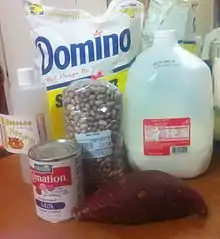 Habichuelas con dulce is made with red beans, cinnamon, nutmeg, coconut milk, evaporated milk, raisins, sugar and salt.[2] The beans are boiled with cinnamon sticks and sweet cloves and then blended to the consistency of soup. The coconut milk and evaporated milk are added along with cooked sweet potato chunks.[3] Cloves and ginger can also be added as flavorings.