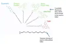 HaloTag is a self-labeling protein tag. It is a 297 residue peptide (33 kDa) derived from a bacterial enzyme, designed to covalently bind to a synthetic ligand. The bacterial enzyme can be fused to various proteins of interest.[1] The synthetic ligand is chosen from a number of available ligands in accordance with the type of experiments to be performed. This bacterial enzyme is a haloalkane dehalogenase, which acts as a hydrolase and is designed to facilitate visualization of the subcellular localization of a protein of interest, immobilization of a protein of interest, or capture of the binding partners of a protein of interest within its biochemical environment.[2] The HaloTag is composed of two covalently bound segments including a haloalkane dehalogenase and a synthetic ligand of choice. These synthetic ligands consist of a reactive chloroalkane linker bound to a functional group.[3] Functional groups can either be biotin (can be used as an affinity tag) or can be chosen from five available fluorescent dyes including Coumarin, Oregon Green, Alexa Fluor 488, diAcFAM, and TMR. These fluorescent dyes can be used in the visualization of either living or chemically fixed cells.[4]