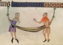 The hammock reappears in unequivocal form in another medieval English source, the Luttrell Psalter (dated to c. 1330), where it has developed to a regular hanging bed.[1] The sling now ends in two rope beckets that anticipate the rings of the naval hammock.[1] Like the earliest known naval specimen[10] the fabric is canvas, not the netting the Spanish later encounter in the New World.[1] The Dutch historian of technology André Sleeswyk argues that it may have been this English type that eventually spread through the European navies despite the word hammock later being adopted from the Americas: