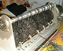 The basic component sound of a Hammond organ comes from a tonewheel. Each one rotates in front of an electromagnetic pickup. The variation in the magnetic field induces a small alternating current at a particular frequency, which represents a signal similar to a sine wave. When a key is pressed on the organ, it completes a circuit of nine electrical switches, which are linked to the drawbars. The position of the drawbars, combined with the switches selected by the key pressed, determines which tonewheels are allowed to sound.[91][92][93] Every tonewheel is connected to a synchronous motor via a system of gears, which ensures that each note remains at a constant relative pitch to every other.[94] The combined signal from all depressed keys and pedals is fed through to the vibrato system, which is driven by a metal scanner. As the scanner rotates around a set of pickups, it changes the pitch of the overall sound slightly.[95] From here, the sound is sent to the main amplifier, and on to the audio speakers.