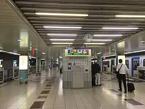 Haneda Airport Terminal 1 Station is served by the 17.8 km Tokyo Monorail Haneda Airport Line from Monorail Hamamatsuchō in central Tokyo to Haneda Airport Terminal 2, and lies 16.9 km from the northern terminus of the line at Monorail Hamamatsuchō.[1]