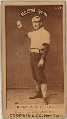 O'Day spent most of 1886 with the Savannah team in the Southern Association, and during his time there he was considered a favorite among other players.[29] In 39 games with Savannah, O'Day won 26 games, lost 11, and had an ERA of 1.03.[26] Late in the year, he joined the Washington Nationals, where he posted a 2–2 record in six games.[23] O'Day became a full-time starter for the Nationals in 1887, and pitched the second-most games behind Jim Whitney. In 30 games, he won 8 games, lost 20, and had a 4.17 ERA and 109 walks; his walks were fifth-highest in the league.[23] In 1888, O'Day became the workhorse of the team, starting 46 games for the Nationals that year. His ERA and win totals improved to 3.10 and 16, but he led the NL in losses with 29 and was second in walks with 117 in 403 innings pitched. He also played eight games at shortstop in 1887 and 1888.[23] O'Day's high loss total was noted by Sporting Life as due to ineffective hitting by the Nationals rather than as a result of his pitching.[30]