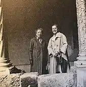 After a year at Marburg, Arendt spent a semester at Freiburg, attending the lectures of Husserl.[8] In 1926 she moved to the University of Heidelberg, where in 1929, she completed her dissertation under the other leading figure of the then new and revolutionary Existenzphilosophie,[45] Karl Jaspers (1883–1969), a friend of Heidegger's.[39] Her thesis was entitled Der Liebesbegriff bei Augustin: Versuch einer philosophischen Interpretation ("On the concept of love in the thought of Saint Augustine: Attempt at a philosophical interpretation").[80] She remained a lifelong friend of Jaspers and his wife, Gertrud Mayer (1879–1974), developing a deep intellectual relationship with him.[81] At Heidelberg, her circle of friends included Hans Jonas, who had also moved from Marburg to study Augustine, working on his Augustin und das paulinische Freiheitsproblem. Ein philosophischer Beitrag zur Genesis der christlich-abendländischen Freiheitsidee (1930),[lower-alpha 12] and also a group of three young philosophers: Karl Frankenstein, Erich Neumann and Erwin Loewenson.[82] Other friends and students of Jaspers were the linguists Benno von Wiese and Hugo Friedrich (seen with Hannah, here), with whom she attended lectures by Friedrich Gundolf at Jaspers' suggestion and who kindled in her an interest in German Romanticism. She also became reacquainted with Kurt Blumenfeld, at a lecture, who introduced her to Jewish politics. At Heidelberg, she lived in the old town (Altstadt) near the castle, at Schlossberg 16. The house was demolished in the 1960s, but the one remaining wall bears a plaque commemorating her time there (see image).[83]