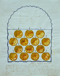 She also made A Little Basket Full of Beautiful Apples in 1856.[2] Adam Gopnik wrote in his article "Shining Tree of Life" for The New Yorker that the drawing is "among the key drawings in American art, with a tonic sense of abundance—all the apples just alike, each with its rub-on of rouge, like blush applied by an adolescent girl—allied to obsessive order."[14]