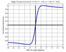 where B, C, D and E represent fitting constants and y is a force or moment resulting from a slip parameter x. The formula may be translated away from the origin of the x–y axes. The Magic Model became the basis for many variants.[9]
