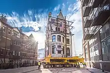 The house was threatened by the development of a new McCormick Place entertainment complex, which will include a basketball stadium for DePaul University and a 1,200-room Marriott Hotel.[4] In lieu of demolishing the building, the Metropolitan Pier and Exposition Authority decided to preserve it by moving it across the street and north one block, at an expense of approximately $6 million, plus $1.9 million for the new lot.[4] On October 1, 2014, the coach house was moved from 2110 S. Prairie Avenue to the new address at 2017 S. Prairie Avenue.[5] The house was moved across the street and in the block north of its original location on November 11–12, 2014.[6] It is one of the heaviest buildings moved in the US, but the record for heaviest is held by China.[4][7][8] The move attracted interest as far away as Reno, Nevada.[9]