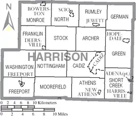 Harrison County is a county located in the U.S. state of Ohio. As of the 2010 census, the population was 15,864,[3] making it the fifth-least populous county in Ohio. Its county seat is Cadiz.[4] The county is named for General William Henry Harrison, who was later President of the United States.[5]