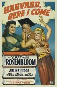 Harvard, Here I Come! is a 1941 American comedy film directed by Lew Landers and stars Max 'Slapsie Maxie' Rosenbloom, Arline Judge, Stanley Brown, Don Beddoe, Marie Wilson, and Virginia Sale.[1] The film is also known as Here I Come in the United Kingdom.