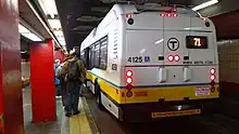 The platform is located on the left side for southbound buses (routes 71 and 73 boarding, and a number of terminating routes). MBTA trolleybuses are equipped with an additional left-hand door for boarding on this level; because this door does not have a farebox, passengers instead pay while alighting from routes 71 and 73.[10][11]