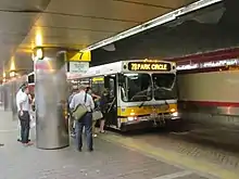 Immediately west of the subway platforms is the 1,380-foot (420 m)-long Harvard bus tunnel, used by MBTA buses and trackless trolleys.[7] Like the Red Line, it is split into two stacked tunnel levels; the northbound level is above and slightly east of the southbound level.[8]:122 Both levels have platforms on their east side, located under Brattle Street southwest of the main lobby. A pair of ramps connect the main station lobby to the platforms; a small set of stairs also connects the lower platform to the west side of the lobby. A headhouse and an elevator to the upper level are located at Eliot Square at the southwest end of the platform.[9]