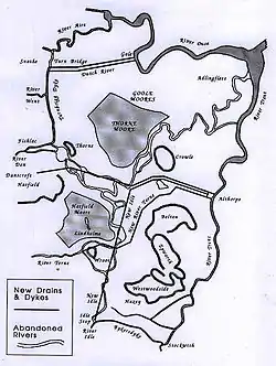 The eastern branch of the Don river was blocked and the banks of the northern branch into the River Aire were raised.[10] The northern branch was originally a Roman navigation channel called Turnbridgedike. A 2-mile (3.2 km) bank which ran along the south side of the river from Fishlake to Thorne included a navigable sluice, to allow boats to reach Sandtoft. Lifting gates gave access to a lock chamber which was 50 by 15 feet (15.2 by 4.6 m). Beyond Thorne, a further bank ran for 5 miles (8.0 km) to the Aire. The River Idle was blocked by a dam and its waters were diverted into the River Trent at Stockwith along Bycarrs Dyke. A 5-mile (8.0 km) barrier bank was constructed along the northern edge of the channel, from the dam to the River Trent. The Torne was embanked and straightened by cutting a drain which emptied via a sluice into the Trent at Althorpe. An 8-mile (13 km) drain was cut from where the Idle had been blocked to Dirtness, passing under the Torne at Tunnel Pits. At Dirtness it was joined by another drain, bringing water from the west, and then ran for a further 5 miles (8.0 km) to another sluice at Althorpe. The work was on a scale not previously seen in England, and Vermuyden's contribution was recognised when he was knighted in January 1629.[11] In 1629, a Court of Sewers for the Level of Hatfield Chase was established by Royal Warrant.[9]