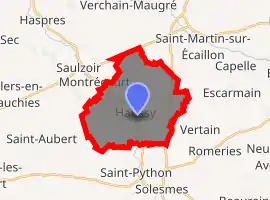 The arms of Haussy are blazoned : Or, a lion gules. (Pont-l'Abbé, Escarmain and Haussy (see also Râches) use the same arms.) |