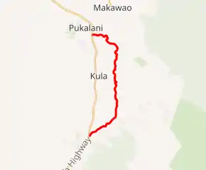 Route 377 is a 9.2-mile-long (14.8 km) road on the island of Maui in Hawaii. The route starts and ends at Route 37, and is signed as Haleakala Highway for the northernmost six miles (9.7 km), and Kekaulike Avenue for the rest, because the Haleakala highway continues on Hawaii Route 378.