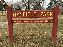 In 1967, Hayfield Elementary School opened[3] then in 1969, the Hayfield Secondary School opened.[4] Both of the schools are part of the Fairfax County Public Schools system. Its mascot is the Hawk.