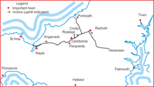The West Cornwall Company decided to improve the Hayle Railway main line, altering its alignment from Hayle to the south of Copperhouse Pool, converging with the old main line at Trenawin, so avoiding the Angarrack inclined plane. At Penponds, the inclined plane was avoided by the construction of a new timber viaduct 693 feet long at a higher level over the valley there, enabling easing of the gradient.[18] The stations at Hayle and Redruth were relocated on the respective new sections of West Cornwall route.