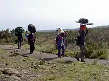 In East Africa, Luo women may carry loads of up to 70% of their own body weight balanced on top of their heads. Women of the Kikuyu tribe carry similar heavy loads, but using a leather strap wrapped around their forehead and the load to secure it while it is carried. (see tumpline) This results in a permanent groove in the forehead of the women. However, there is no evidence of other harmful effects on the health of women who carry heavy loads on top of their heads. Researchers speculate that training from a young age may explain this. Up to 20% of the person's body weight can be carried with no extra exertion of energy.[5] Other researchers have shown that African and European women carrying 70% of their body weight in controlled studies used more oxygen while head-carrying, in contrast to carrying a load on their backs. The research did not support the notion that head-loading is less exerting than carrying on the back, "although there is some evidence of energy saving mechanisms for back-loading at low speed/load combinations".[6]