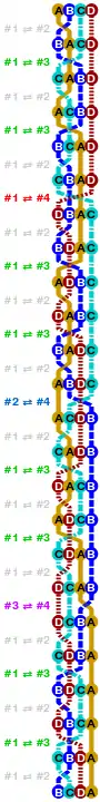 1,2,3,4,5 ... Original Array 4,1,2,3,5 ... 1st iteration (Permute subset/Rotate subset) 5,1,2,3,4 ... 1st iteration (Swap) 3,5,1,2,4 ... 2nd iteration (Permute subset/Rotate subset) 4,5,1,2,3 ... 2nd iteration (Swap) 2,4,5,1,3 ... 3rd iteration (Permute subset/Rotate subset) 3,4,5,1,2 ... 3rd iteration (Swap) 1,3,4,5,2 ... 4th iteration (Permute subset/Rotate subset) 2,3,4,5,1 ... 4th iteration (Swap) 5,2,3,4,1 ... 5th iteration (Permute subset/Rotate subset) 1,2,3,4,5 ... 5th iteration (Swap) ... The final state of the array is in the same order as the original