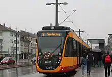 Because of delayed approval for the use of EEO for the ET 2010 (part of the Bombardier Flexity Swift family) vehicles, the section between Kaufland and Neckarsulm was temporarily dedicated as a BOStrab line.[7] On 4 November 2013 the first test run took place on this section.[8] Until the reclassification of the northern section of the line as an EEO route and its connection to the DB network in December 2014, Stadtbahn services could only operate as far as Neckarsulm. The operation of trains through to Sinsheim was delayed until 1 May 2015 by the renovation of a bridge in Bad Wimpfen.[9]