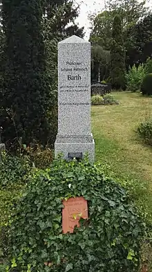 Barth died in Berlin on 25 November 1865 aged 44.[lower-alpha 1] His grave is preserved in the Protestant Friedhof III der Jerusalems- und Neuen Kirchengemeinde (Cemetery No. III of the congregations of Jerusalem's Church and New Church) in Berlin-Kreuzberg, south of Hallesches Tor.