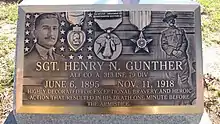 American Expeditionary Forces commanding General John J. Pershing's "Order of The Day" on the following day specifically mentioned Gunther as the last American killed in the war.[9] The Army posthumously restored his rank of sergeant and awarded him a Divisional Citation for Gallantry in Action and the Distinguished Service Cross. Several years later, a post, number 1858 of the Veterans of Foreign Wars in east Baltimore, was named after him.[2][3][10] The VFW Post honoring the name of Sergeant Gunther has since ceased to exist.