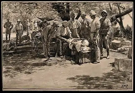 RAMC Officer bandages a wounded man at Paardeberg Drift (after a photo by Reinhold Thistle)