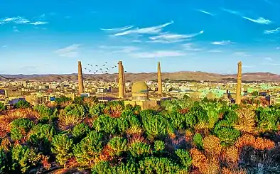 Herat dates back to Avestan times and was traditionally known for its wine. The city has a number of historic sites, including the Herat Citadel and the Musalla Complex. During the Middle Ages Herat became one of the important cities of Khorasan, as it was known as the Pearl of Khorasan.[5] After the conquest of Tamerlane, the city became an important center of intellectual and artistic life in the Islamic world.[6] Under the rule of Shah Rukh the city served as the focal point of the Timurid Renaissance, whose glory matched Florence of the Italian Renaissance as the center of a cultural rebirth.[7][8] After the fall of the Timurid Empire, Herat has been governed by various Afghan rulers since the early 18th century.[9] In 1717, the city was invaded by the Hotaki forces until they were expelled by the Afsharids in 1729. After Nader Shah's death and Ahmad Shah Durrani's rise to power in 1747, Herat became part of Afghanistan.[9] It witnessed some political disturbances and military invasions during the early half of the 19th century but the 1857 Treaty of Paris ended hostilities of the Anglo-Persian War.[10]