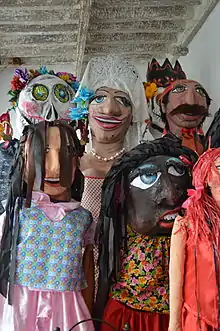 However, Arroyo is best known for work which was outside the scope of his mentor. San Miguel has had a long and strong tradition with oversized puppet figures called “mojigangas.” Made of strong papier-mâché called “cartonería” and fabric over a cane or wire frame, these were introduced by the Spanish during the colonial period. These puppets are worn on a dancer, who supports the top-heavy figure with straps over the shoulders, while participating in a festival or procession. Originally the figures were religious, but today in San Miguel, the figures are generally historical, from popular culture or of brides and grooms as part of weddings... a tradition particular to San Miguel.[2][3][4]
