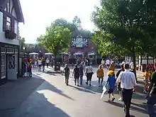 Hersheypark developed a number of themed areas, the first being Carousel Circle, Der Deitch Platz, and Animal Garden in 1972,[23][24] followed by Tower Plaza in 1975,[25] Pioneer Frontier in 1985, Midway America in 1996,[18] as well as The Boardwalk at Hersheypark in 2007.[26][27] In 2014, Hersheypark merged several theme areas – Tudor Square, Rhineland, Founder's Circle and Music Box Way, became an area called Founder's Way, while the coal mining region themed area Minetown was re themed as Kissing Tower Hill. The themed areas had featured different music to each area, such as polka-style songs being played in Der Deitch Platz and Carousel Circle, country music being played in the Pioneer Frontier themed area, the Beach Boys being played near Tidal Force and later in The Boardwalk, as well as Ragtime and jazz music being played in Midway America. However, the music was phased into being the same across the park, except in The Boardwalk and Pioneer Frontier. In the summer of 2020, Hersheypark opened a new themed area called Hershey's Chocolatetown, which included a new entrance plaza, ice cream parlor, flagship retail store, and a Bolliger & Mabillard hyper coaster named Candymonium.[28]