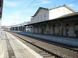 All lines leaving Aachen in northern direction station stop at Herzogenrath. There are Regional-Express and Regionalbahn trains serving the station with a regular interval timetable, additionally, one InterCity long-distance train per day heading towards the German capital Berlin stops in Herzogenrath.[4] The Euregiobahn line RB 20 split here until December 2016, each second train went to Heerlen, the other one to Alsdorf-Annapark. Since December 2016 and the completion of the so-called Ringbahn railway line between Herzogenrath and Stolberg, the RB 20 trains do not split up in Herzogenrath anymore but all run towards Alsdorf-Annapark. Vicariously, a new line called RE 18 was implemented.