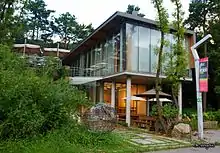 Heyri Art Valley is Korea's largest artistic community with an area of approximately 495,868 square metres (5,337,480 sq ft). In 1997, Heyri was conceived as a planned settlement. It began in 1998 with an inaugural meeting attended by 380 cultural artists. This unique community village integrates concepts that coexist in the fields of production, exhibit, sales, and habitation of cultural art. From a functional perspective, the Heyri Art Valley was planned with an urban form that focused on cultural businesses.[1] It is home to many galleries, museums, exhibit halls, concert halls, small theaters, cafes, restaurants, bookstores, guest houses, art shops, and creative living spaces for artists. Each building was designed by dozens of nationally and internationally renowned architects, who also designed features of the natural landscape, such as mountains, hills, swamps, and brooks.[2] The community derives its name from a traditional Nongyo (farming song), "the sound of Heyri," native to the region.[1]