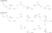 Studies of yeast Esa1 from the MYST family of HATs have revealed a ping-pong mechanism involving conserved glutamate and cysteine residues.[16] The first part of the reaction involves the formation of a covalent intermediate in which a cysteine residue becomes acetylated following nucleophilic attack of this residue on the carbonyl carbon of acetyl-CoA. Then, a glutamate residue acts as a general base to facilitate transfer of the acetyl group from the cysteine to the histone substrate in a manner analogous to the mechanism used by GNATs. When Esa1 is assembled in the piccolo NuA4 complex, it loses its dependence on the cysteine residue for catalysis, which suggests that the reaction may proceed via a ternary bi-bi mechanism when the enzyme is part of a physiologically relevant multiprotein complex.