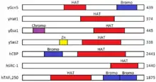 HATs act as transcriptional co-activators or gene silencers and are most often found in large complexes made up of 10 to 20 subunits, some of which shared among different HAT complexes.[23] These complexes include SAGA (Spt/Ada/Gcn5L acetyltransferase), PCAF, ADA (transcriptional adaptor), TFIID (transcription factor II D), TFTC (TBP-free TAF-containing complex), and NuA3/NuA4 (nucleosomal acetyltransferases of H3 and H4).[1][23] These complexes modulate HAT specificity by bringing HATs to their target genes where they can then acetylate nucleosomal histones.[23] Some HAT transcriptional co-activators contain a bromodomain, a 110-amino acid module that recognizes acetylated lysine residues and is functionally linked to the co-activators in the regulation of transcription.[27]
