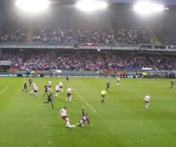 Despite the club's successes, Derry City's path has not always been a smooth one. In September 2000, the club was in a crippled position from a financial perspective and on the verge of bankruptcy due to an unpaid tax bill. The Inland Revenue totalled the debt in the region of £180,000. The position had not been helped as the club was hit with misery on 27 July earlier that same year when the then-chairman, Kevin Friel, was killed in a road accident near Raphoe, Co. Donegal.[19] Nevertheless, Jim Roddy convened a meeting of the club's shareholders and supporters to inform them that the club had debts nearing £180,000. Prior to that meeting Martin O'Neill, then manager of Scottish giants, Celtic, contacted Roddy, the stand-in chairman, to inform him that he would bring his side to the Brandywell in order to help raise funds for the beleaguered club.[20] A number of other fund raising projects were also put together to help pay of the debts. Local band, the Undertones, played a benefit concert on 29 September, door to door collections took place around the city, while Phil Coulter, a singer from the city, hosted a golf classic on 27 September.[21] Significantly, Derry-born politician John Hume, then a Member of the European Parliament for Northern Ireland, also helped by using his contacts in the parliament along with his powers of persuasion to convince a number of former European Cup winners to come to the Brandywell and play friendly matches to raise funds through gate receipts and save the club from extinction.[22] Manchester United,[23] FC Barcelona[24] and Real Madrid,[25] as well as Celtic, all visited Derry with star-studded teams between then and 2003 in order to help the club survive. The game against Barcelona is fondly remembered on the Brandywell terraces as the day that firm fan-favourite and club legend, Liam Coyle left the Catalan club's Carles Puyol "on his arse" as he utilised his trickery to beat the defender.[26][27] The money brought through the turnstiles helped to keep the club in operation, but just about, as results on the field continued to deteriorate and Derry soon came dangerously close to relegation – something which would have been a financial nightmare for the club.