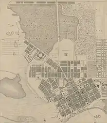 Bourke also commissioned Robert Hoddle to make the first plan for the town, completed on 25 March 1837, which came to be known as the Hoddle Grid.[12] The surveys were intended to prepare for land sales by public auction. Bourke visited Port Phillip in March 1837, confirmed Lonsdale's choice of a site for the new town and named it Melbourne on 10 April 1837[13] after the then British prime minister William Lamb, 2nd Viscount Melbourne, who resided in the village of Melbourne in Derbyshire. The General Post Office opened under that name on 13 April 1837.[16] Before being officially named, the town had several interim names – including Batmania, Bearbrass, Bareport, Bareheep, Barehurp and Bareberp.[14][15][16] Public auctions for land began in June 1837. The compensation of the Port Phillip Association were only recognised to the extent of £7,000, allowed as a reduction on the purchase price of land bought by the association. Most of the members sold their entitlements to Charles Swanston.