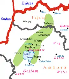 In 1329, Emperor Amda Seyon campaigned in the northwest provinces of Semien, Wegera, Tselemt, and Tsegede, in which many had been converting to Judaism and where the Beta Israel had been gaining prominence.[3] He sent troops there to fight people "like Jews" (Ge'ez ከመ:አይሁድ kama ayhūd).[4]