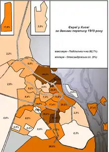 In the 19th century the Jewish community flourished and became one of the biggest communities in Ukraine. In 1815, the Jewish population was 1,500, and would continue to grow, reaching over 81,000 nearly one hundred years later in 1913.[4] In that period many synagogues were built including the city's main synagogue, the Brodsky Choral Synagogue. Jewish schools and workshops were built all around the city.
