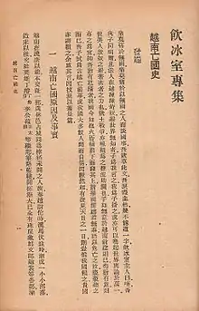 It was published by Liang Qichao, a leading Chinese nationalist revolutionary scholar then in Japan, who assisted Chau during his time attempting to drum up support for Vietnamese independence in China. The book was intended for distribution mainly in China and abroad, but also for smuggling into Vietnam to rally people to the cause of Vietnamese independence.[3] The book helped popularize the word "Vietnam." At the time, the country was generally called "Annam."