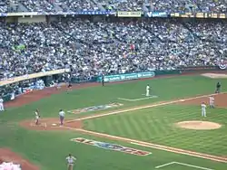 During the World Series on October 11, 1967, Finley announced his choice of Oakland over Seattle as the team's new home.[12][13] A week later on October 18 in Chicago, A.L. owners at last gave him permission to move the Athletics to Oakland for the 1968 season.[14][15] According to some reports, Cronin promised Finley that he could move the team after the 1967 season as an incentive to sign the new lease with Municipal Stadium. The move came in spite of approval by voters in Jackson County, Missouri of a bond issue for a brand new baseball stadium (the eventual Royals Stadium, now Kauffman Stadium) to be completed in 1973. Senator Stuart Symington of Missouri blasted Finley on the floor of the U.S. Senate, calling Oakland "the luckiest city since Hiroshima."[16] When Symington threatened to have baseball's antitrust exemption revoked, the owners responded with a hasty round of expansion. Kansas City was awarded an American League expansion team, the Royals. They were initially slated to begin play in 1971, but Symington was not willing to have Kansas City wait three years for another team, and renewed his threat to have baseball's antitrust exemption revoked unless the expansion teams — the Royals and the Seattle Pilots — began play in 1969. The owners complied, but while Kansas City was major league ready, Seattle was not; its stadium problems affected profitability and ultimately forced the sale and move to Milwaukee after only one season as the Pilots.