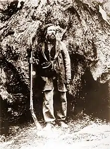 Human habitation in the Sierra Nevada region of California reaches back 8,000 to 10,000 years ago.[1] Historically attested Native American populations, such as the Sierra Miwok, Mono and Paiute, belong to the Uto-Aztecan and Utian phyla. In the mid-19th century, a band of Native Americans called the Ahwahnechee lived in Yosemite Valley. The California Gold Rush greatly increased the number of non-indigenous people in the region. Tensions between Native Americans and white settlers escalated into the Mariposa War. As part of this conflict, settler James Savage led the Mariposa Battalion into Yosemite Valley in 1851, in pursuit of Ahwaneechees led by Chief Tenaya. The California state military forces burned the tribe's villages, destroyed their food stores, killed the chief's sons, and forced the tribe out of Yosemite. Accounts from the Mariposa Battalion, especially from Dr. Lafayette Bunnell, popularized Yosemite Valley as a scenic wonder.